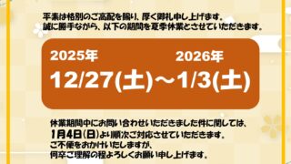 拝啓 時下ますますご清祥のこととお慶び申し上げます。平素は格別のお引き立てを賜り厚く御礼申し上げます。 誠に勝手ながら、以下の期間を休業とさせていただきます。 年末年始休暇期間2025年12月27日(土)~2026年1月3日(土) ※休業期...